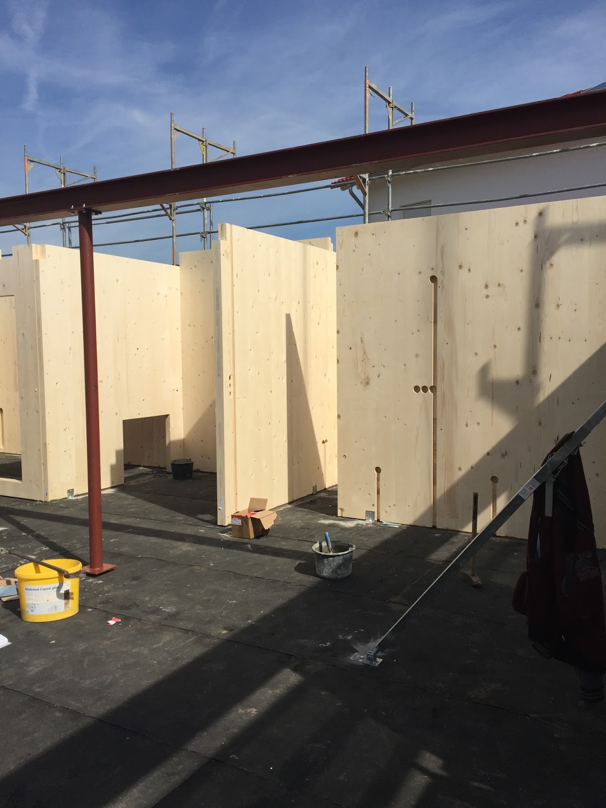 Die fertigen Wandelemente haben den Bauvorgang enorm beschleunigt. Die Organisation war vorbildlich. Alles geschah fast gleichzeitig: der Aufbau des Gerüsts, die Lieferungen und die Wandmontage. Am Ende des Tages hatten wir das Erdgeschoss und das Obergeschoss fertig. Die Bauarbeiter haben schon mit dem Dachstuhl angefangen.